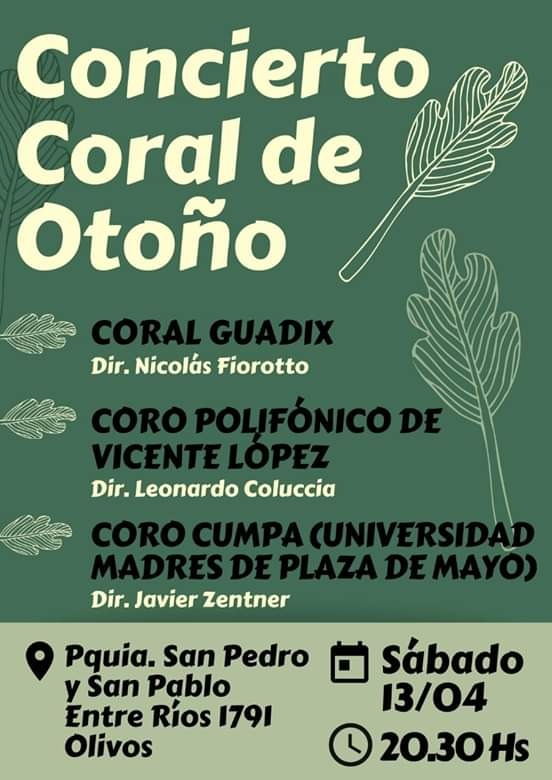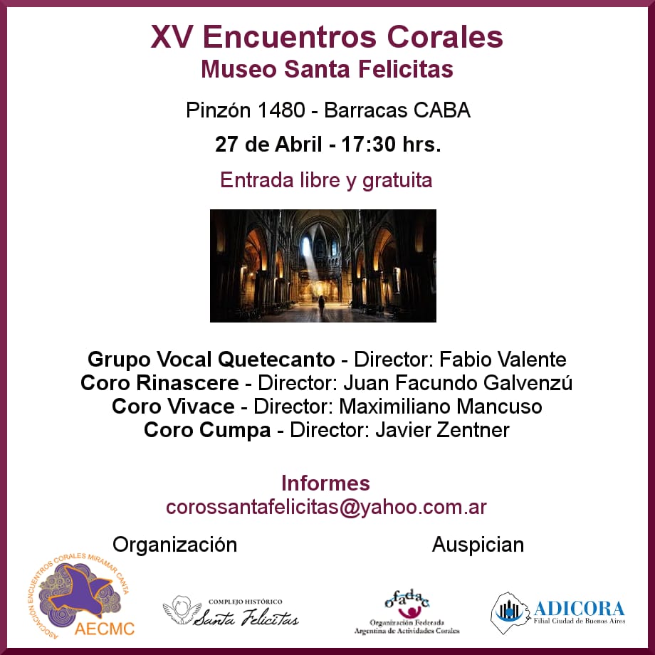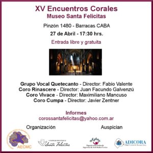 Entramos al Templo Escondido en el primer piso y nos acompañarán el Grupo Vocal Quetecanto, cuyo director es Fabio Valente; el Coro Rinascere, dirigido por Facundo Patiño y el Coral Vivace, a cargo de Maximiliano Mancuso. Por supuesto, como siempre, seremos dirigidos por nuestro maestro Javier Zentner.