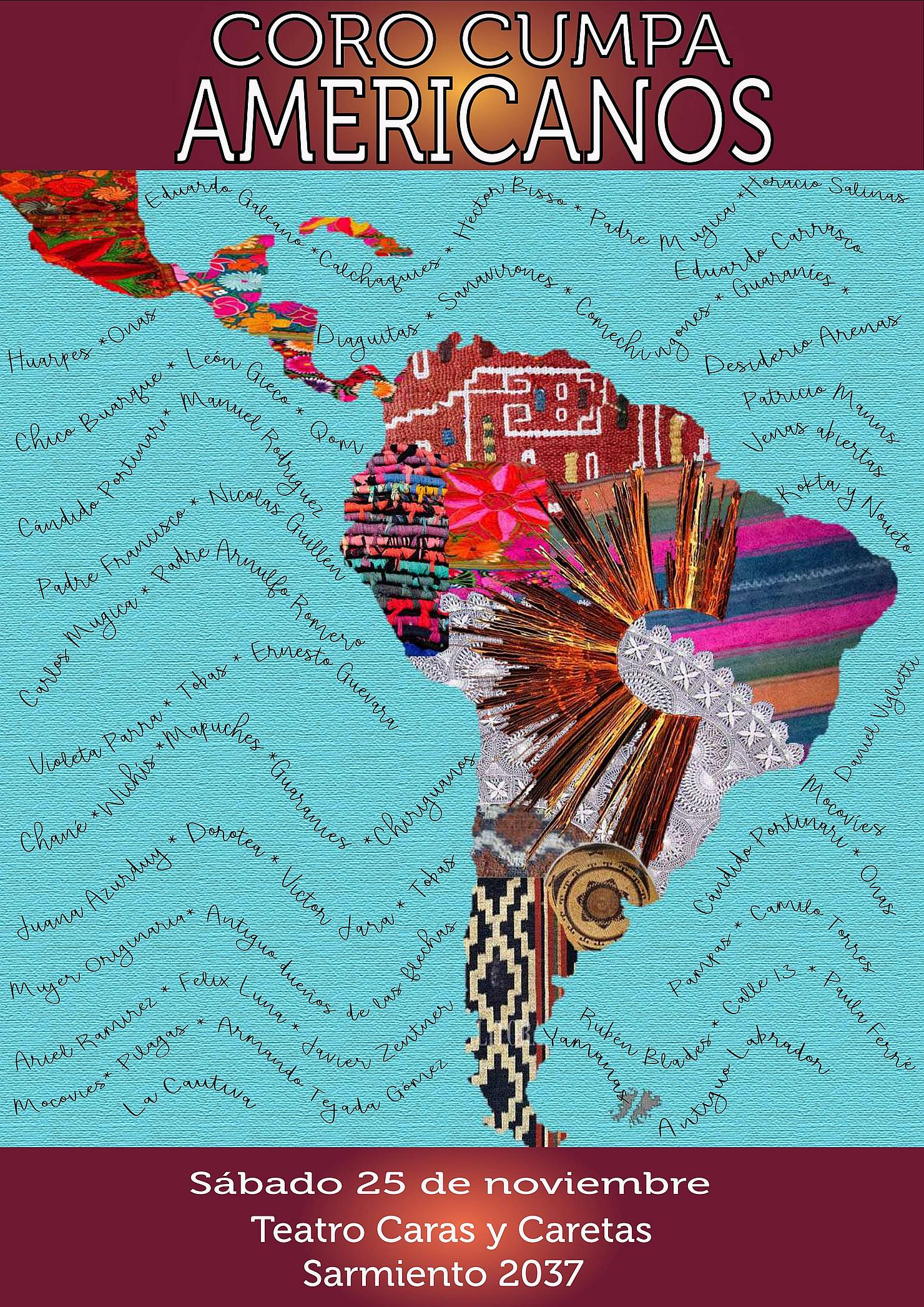 Con la dirección general y artística del M° Javier Zentner, la puesta en escena de Gaby Goldberg, la realización de video de Diego Aparicio y la participación del Ballet Folclore en Movimiento, AMERICANOS —como los dos espectáculos anteriores del Coro CUMPA— vuelve a poner sobre el escenario y en clave de estética coral, un pedazo de la historia que nos atraviesa y nos constituye.